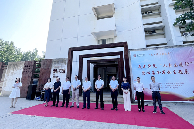 Recently, the Calligraphy and Painting Exhibition for Charity Sale organized by the School of Fine Arts was launched at the Art Gallery of Jiangsu Normal University (JSNU). Vice President Wang Xiaosan, persons in charge from relevant departments and representatives from various sectors of society were invited to the opening ceremony. The leadership team of the School of Fine Arts, as well as teacher and student representatives, participated in the event.