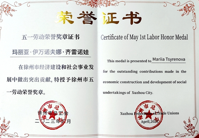 After selections, comprehensive evaluations, and publicity by various units, recently, Xuzhou Federation of Trade Unions, Xuzhou Municipal Bureau of Education, Xuzhou Women’s Federation, and other units have successively commended a number of advanced collectives and individuals. MARIIA TSYRENOVA, a Russian teacher from the Sino-Russian Institute of Jiangsu Normal University (JSNU), won the “Xuzhou May 1st Labor Honor Medal” in 2023. Kuang Yanli, a teacher from the the School of Marxism of JSNU, was awarded the title of “Xuzhou Model Teacher” in 2023. And Zhang Ailing, a teacher from the School of Chinese Language and Literature of JSNU, was awarded the title of “Xuzhou Outstanding Female Teacher” in 2023.