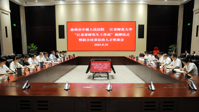 On August 25th, JSNU (Jiangsu Normal University) and Xuzhou Intermediate People’s Court jointly held the unveiling ceremony of Jiangsu Postgraduate Workstation and a forum on jointly training legal talents. Two leaders of both sides attended the event and jointly unveiled the board together.